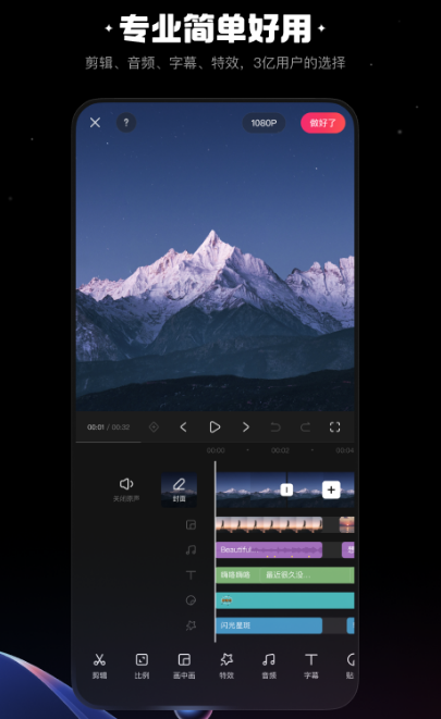 集视频与音频处理于一体的强大工具,提供丰富的剪辑选项,包括音乐裁剪、文字动画设计等特色功能,帮助用户快速提升内容表现力,让每一段作品都更具个性与辨识度。