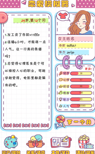 游戏设置较为多样的任务和活动玩法,主线任务主要围绕恋爱故事展开,它会像一位贴心的向导,引领玩家慢慢走进各个角色的内心世界,了解他们背后的故事,进而推动彼此情感的升温。在主线故事里,玩家可能会需要协助角色攻克学习上的难关,或者参与到某项校园活动的策划筹备工作中。当玩家顺利完成这些任务后,与心仪对象之间的关系也会自然而然地更进一步,留下一段段关于爱情的甜蜜回忆。