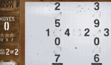 《零和》这部作品完美的映射了零和博弈的概念,通过对于数字游戏精良的改编,又采用了穿插式的玩法设计,游戏从上到下,都根据数字之间的基数关系进行了布局,玩家需要根据数字进行穿插移动,使其能够完美的依据公式,把最后的数值归零即可,在挑战中会根据数字的范围,以及公式进行多变的改动。