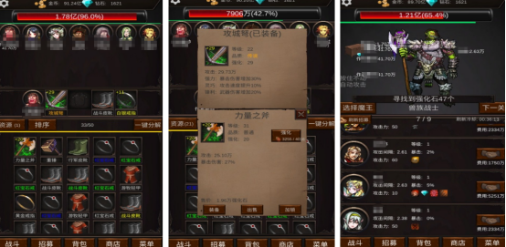 文字形式展现,却给玩家带来了极强的可玩性,所有的装备都靠刷,无需复杂的操作,也可用挂机的模式轻松获得,当每次获得了大量的装备值之后,即可放入自己的背包中,而在下方又会呈现多样的选项,比如角色或者仓库等等,已经营造出了很多随机的袭击事件,每次事件发生后,都会营造极高的挑战难度,只要完成任务之后即可获得大量装备。