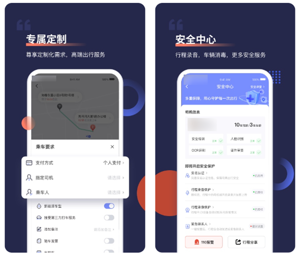 可以对车辆和出行进行深度的定制,包括接送的地点、使用的车型、乘坐的人数,能够清晰看到对应的预计价格,甚至还可以指定司机等。在安全中心中可以看到车辆行驶的实时位置、设置紧急联系人,还是比较靠谱的。