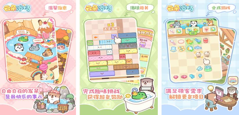 《云朵浴场》以其实独特的玩法和温馨的画风受到许多玩家的喜欢,核心玩法就是接待顾客,解决顾客在洗浴中遇到的麻烦。躺平是游戏的宗旨,也是对玩家的治愈,毕竟自由自在发呆的时候是最快乐的。想要解锁更多区域,升级建筑物的玩家还可以通过滑动屏幕的方式玩消除哦。