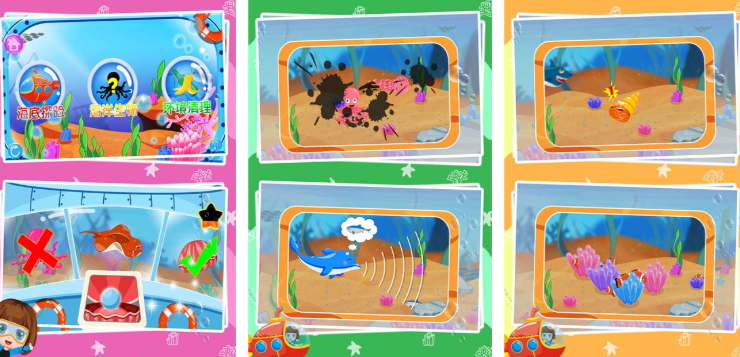 贝贝探索海底世界手游特别适合小朋友,可以操控贝贝在海底逛,点一下小丑鱼它就会绕着珊瑚礁转圈还会吐泡泡,滑动屏幕摸海龟,它会缩到壳里过一会再慢慢伸出来,攒够星星能解锁新地方,去深海看会发光的灯笼鱼,去极地看可爱的企鹅,还能玩小游戏拼生物拼图或者消除泡泡,玩游戏的时候还能听语音介绍。