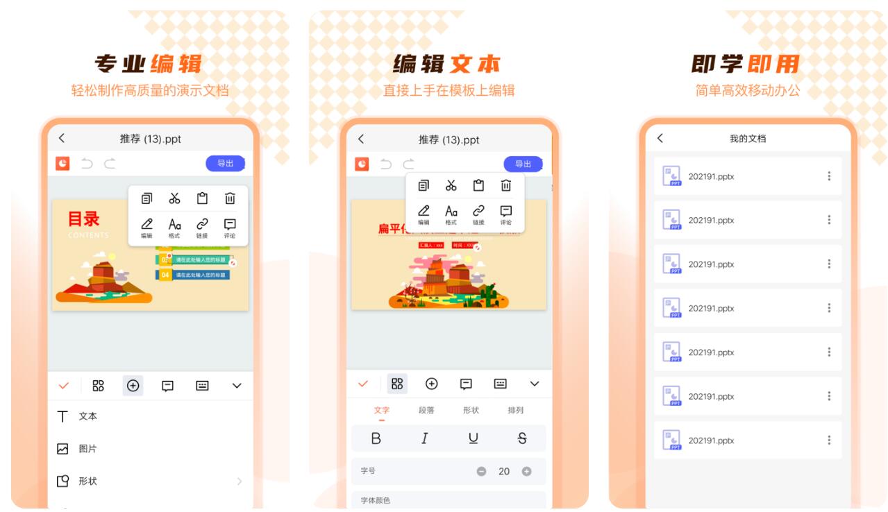 主要针对文档编辑的一款app,基本的文字内容可以轻松在软件当中完成处理,同时大家还可以选择不同的格式,目前也支持在线制作PPT文件。对于新手来说,教程内容也十分的新颖,有助于各位更快上手。除了在app当中建立各种文件以外,大家还可以将本地文档导入到其中进行编辑,让各位轻松处理各种不同的文件,这样工作就会更简单。