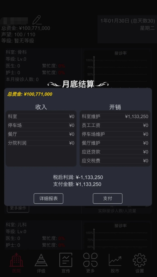 各位可在这款以文字为主题的医院游戏里体验经营它的乐趣。整座医院的所有都将以文字的形式摆在各位的眼前,人们要做的就是处理好医院内的各项事务,控制好支出成本,避免医院的营业额出现负数。每一个经营周期结束后,各位都能通过统计来查看医院的经营情况,若多个周期不达标很可能会破产,股价也会随之跌落到谷底。当然,各位也能通过自己优秀的经营手段,让医院能实现日进斗金。