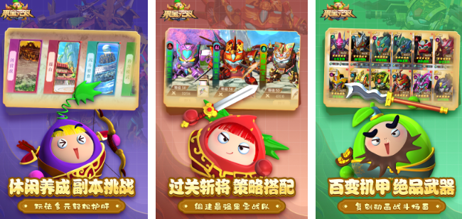 果宝三国创新性地融入三国历史元素,构建了独特的三国水果世界,游戏故事讲述了果宝们意外穿越至三国时期,发现水果世界被邪恶势力入侵,各路水果英雄纷纷效仿三国名将,组建军队,展开了一场守护水果世界的三国争霸之战,玩家将在游戏中扮演果宝英雄,招募伙伴,组建自己的果宝军团,参与到这场充满奇幻色彩的战斗中。
