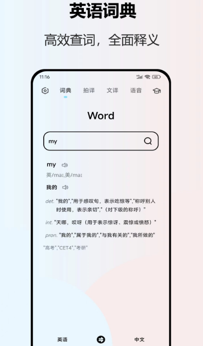 在这款词典当中,既有英汉互译功能,更提供了海量的英语单词具体的发音,还有释义,具有便捷的查询功能。比如当自己在学习英语的过程当中,有一些词汇不知道该怎么读,就可在应用当中利用搜索词汇的方式,就能显示出英文单词。其中既有常见的词汇,还有适合雅思、托福等各个考试的词汇内容。想要让自己的英语水平得到提高,还可制定学习目标。