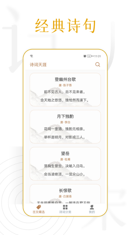 诗词天涯是一款能够自定义诗词背景的应用,使页面呈现更加赏心悦目的效果,进一步提升了阅读诗歌的美感。此外,该应用还具备智能检索功能,能够方便地搜索所需的诗人和诗歌,无论是哪位诗人、哪首经典的诗词,应有尽有。同时,页面设计也非常简约,使阅读诗歌带来视觉上的享受。通过诗词天涯,我们能够畅快地阅读各种优美的诗词,深入感受其中的情感与意境。这款应用为诗歌爱好者提供了一个优雅、便捷的平台,帮助我们更好地欣赏和传承诗词的魅力,并丰富我们的文化修养。