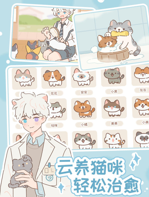 水彩画风看着比较舒服,剧情用漫画那种分镜展示出来。给流浪猫取的名字会影响后面的对话内容,主线讲主角跟猫的关系,还有八个猫耳少年能解锁支线剧情看。猫做得挺真实,摸它会眯着眼睛,饿了就拍食盆,生病了要喂药。猫耳少年害羞时耳朵会变红,高兴了尾巴会摇。能装饰房子从猫窝到整个屋子都能弄,院子里种的猫草还会跟着季节变样。