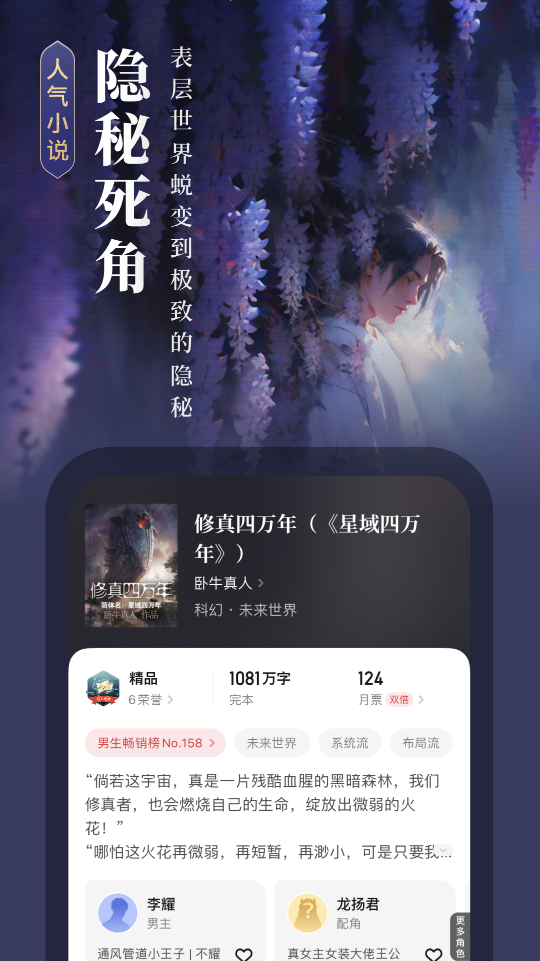 该平台发布了武侠、都市玄幻、现代言情、历史等不同题材内容,用户们实时查阅海量书目,从热门IP到小众故事等,欣赏精美绝伦的界面,自由设定段落间隔等。