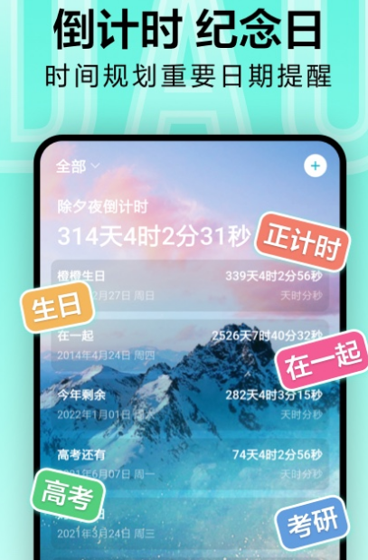 合理定制倒计时目标能够,能够让我们在短时间内高效完成计划,根据目标的具体性安排倒计时时间,这样能够让用户拥有足够的动力和信心,也不会觉得过于疲。这款倒计时软件是时间规划大师,可当做生活中小助手来使用,每当重要的日子都能够记录并开启倒计时。有备忘录、记事本、日历提醒等多种小工具。有强大的事项提醒及万能小组件,时刻提醒重要事宜避免忘记。