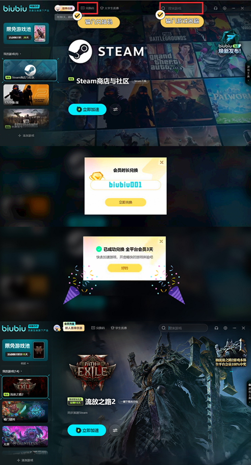 看到这里大家已经明白编年史的入口在什么地方,玩家小体验游戏下载游戏别忘记要选择一款加速器。可以直接点击以上的链接,现在流放之路2还可以享受限免,限免的时间是12月7日到12月20日,并且现在还有抽奖活动。除了这一个福利之外,新用户在完成注册后可以解锁24小时免费加速时长,要是在页面输入兑换码【biubiu001】能够在原本的基础上又免费72小时,把这两者加在一起,一共是免费96小时。