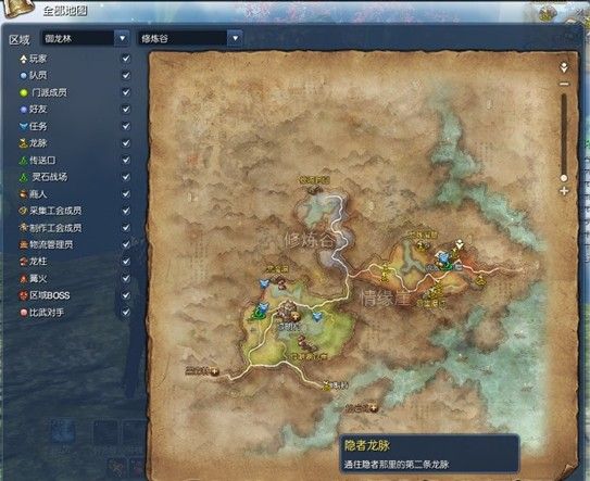 玩家们可以看到很多的黄色标记,这就是龙脉。我相信玩家们都看过那些通过龙脉飞来飞去的视屏吧~其实没什么~也就一轻功叫腾龙驾脉~