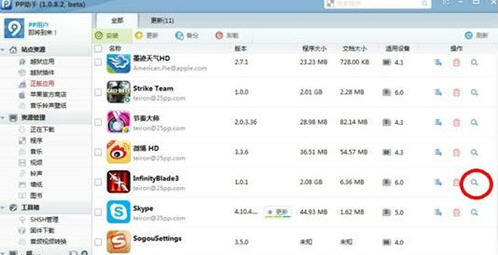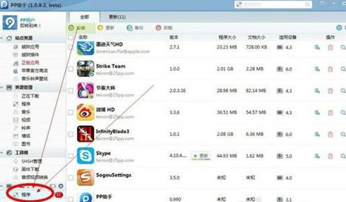 接下来打开你的ITOOLS或者PP助手一类的软件,连上你的苹果设备点击程序