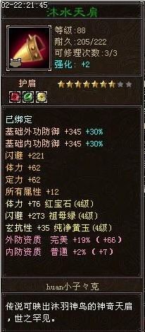 耐久度:耐久度的两组数值212/235,前面一个数值表示当前耐久度,后面一个数值表示原始耐久度,当当前耐久度降低到原始耐久度的10%及以下时候,当先耐久度就出现红色字体,这时候可以到苏州的薛菲处修理,薛菲修理装备有10%的失败几率,失败以后可修理次数少1。