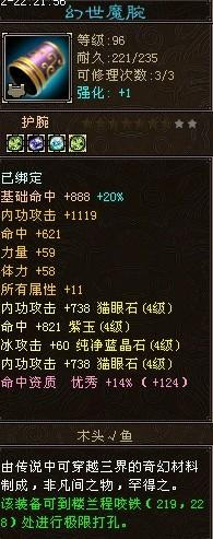 假设装备都有体力,以90+的手工上的体力为例,5星装备的体力一般是31-40点,6星装备是40-60点,7星装备是60-80点,8星是80-100点,9星是100+点。事实上,加成100以上的已经非常罕见了,不过从重楼玉、重楼戒和华南电信一区的鼓浪闻涛服务器中的9星装备可以看见9星至少是100+的属性,由于非常罕有,所以不做详细分析。当然,也不排除分界点有上下浮动的现象,例如偶尔会出现5星装备+41点体力,而6星装备+40点体力的,上图的7星幻世魔腕按理论分析应该是60+的,但是才+58点的体力,这就是一个例外。