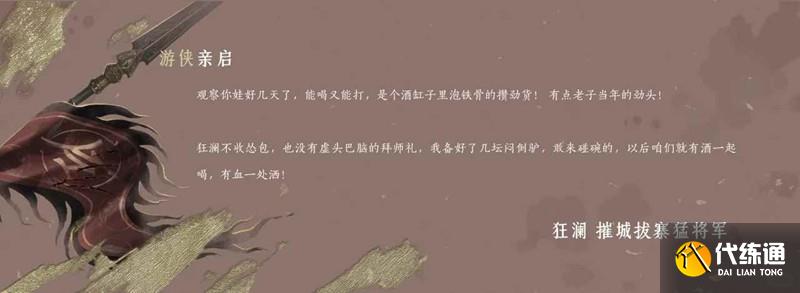 狂澜弟子以酒为命,入门后自当与众同门纵情豪饮。未饮时,尚能自持,自称断关骁将、镇疆都统;醉后却狂笑震天,敢称摧城拔寨猛将军、弑神伐庙狂都统!