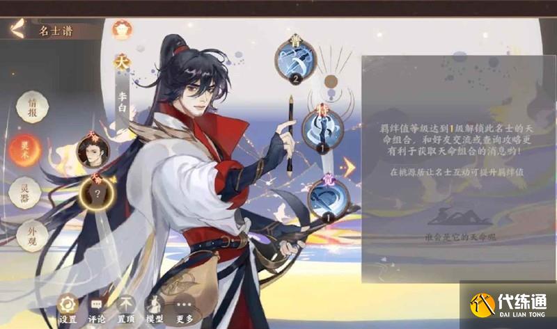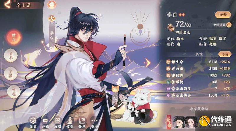 忘川风华录名士的主要属性分为生命、敏捷、暴击强度、攻击、防御等。每一位名士的主要属性都不相同,用户根据关卡的特点,以及名士主要属性的匹配度,进行出战阵容、名士灵气相关的搭配。初始30必得的天卡之一李白,新手用户应该怎么搭配使用呢?小编为你准备了一份攻略,~