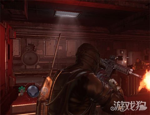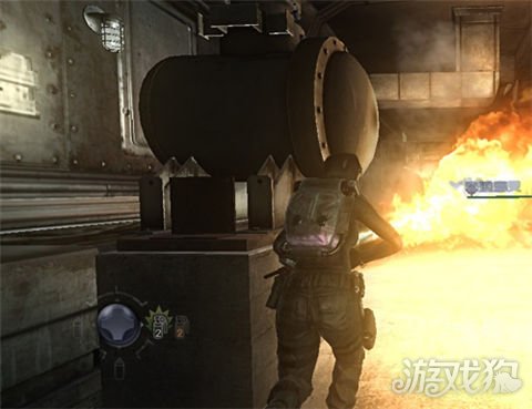 进实验室会遭遇杂兵,在掩体后熟悉操作,身旁有弹药可捡,误按下发现键位3为团队回血.迅速解决敌人后下阶梯