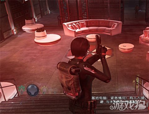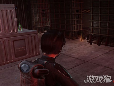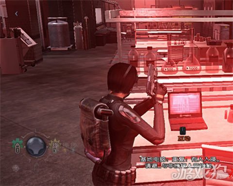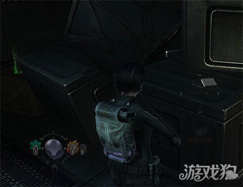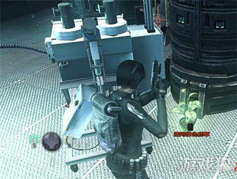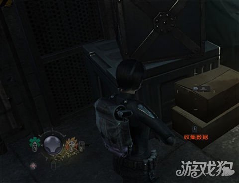再次遇到无AI杂兵,提示按G用手雷群歼.附近有一台可以搜集情报的电脑,和两颗绿草药,身旁有个弹药补给箱,消灭下方和天桥上的敌人后下阶梯,