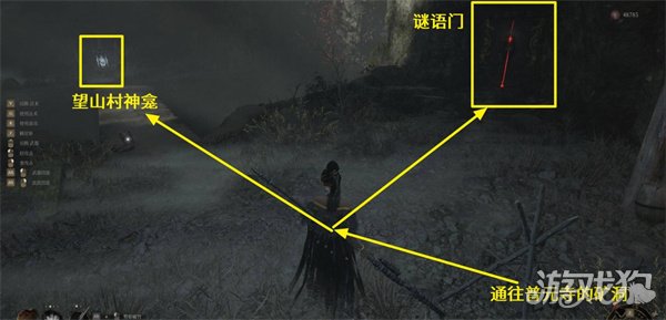 谜题门位于矿洞出口左侧,桥对面即为【云顶城 - 望山村】的神龛,建议先激活以便传送。