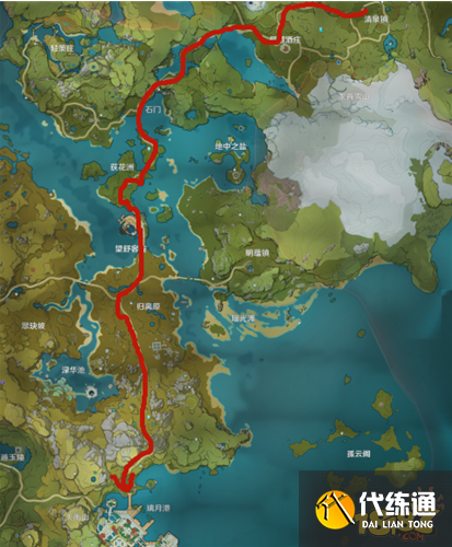 这里提供一个从蒙德城走到璃月港的行走路线:蒙德城-清泉镇-晨曦酒庄-石门-荻花洲-望舒客栈-旧离原-璃月港。就是从晨曦酒庄那里,一直沿着水路走,就可以直达璃月港,距离相当于1/2地图的长达。