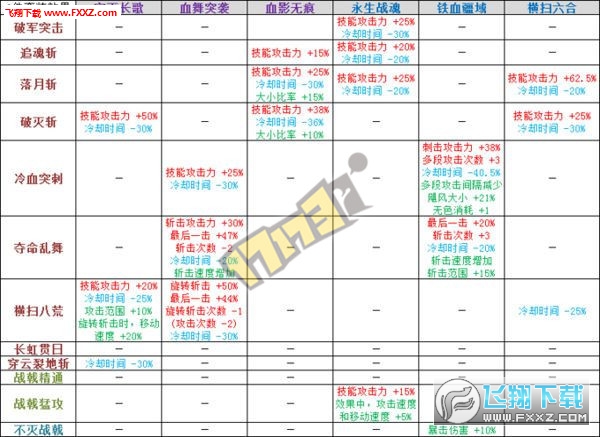 表2,可以看出寂灭长歌6对于[破灭斩]技能攻击力的增加已经达到50%,同时减少了30%冷却时间,和血影无痕3散搭[破灭斩]攻击力和冷却增幅明显,可以做6+3;还有[横扫八荒]技能攻击增加20%,冷却时间减少25%,攻击范围和移动速度增加,增加的比较全面(但没什么卵用)。血舞突袭6对于[冷血突刺]、[夺命乱舞]、[横扫八荒]这3个出了名的墨迹技能增加技能攻击力很明显,也减少了攻击次数,使得技能不那么墨迹,不过和9件套比起来还差得有点儿远。血影无痕6,小技能加的太明显,显然这套不可能做为输出套了,搬砖效果很好。永生战魂6,你还是也去搬砖吧。横扫六合6,你也跟着去搬砖!最后,铁血疆域6,[不灭战戟]换装必备(20级不灭+铁血6=60%暴击伤害)。
