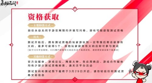 除了上述方式,用户还可以通过永劫无间手游公众号、官方预约H5、小程序、各应用商店及合作媒体等渠道获取测试资格。正式发码时间为3月29日,请确保从官方渠道获取,切勿相信任何二手交易或伪装成官方的私下发码行为。