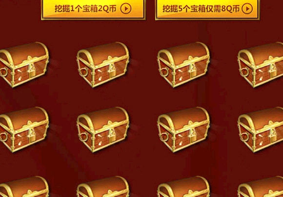 1、2Q币可“挖掘一个宝箱”(打开1个木质宝箱),8Q币可“挖掘五个宝箱”(含4个木质宝箱+1个金框宝箱),金框宝箱有几率产出更多极品道具!