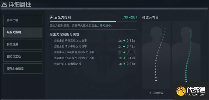 改装后的武器后坐力被调整至贴近于标靶头部,子弹的分布明显比改装前更加密集,后坐力线的向右摆动被拉正,在持续射击情况下意味着敌人受到伤害的子弹更多。