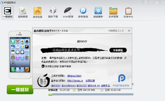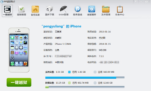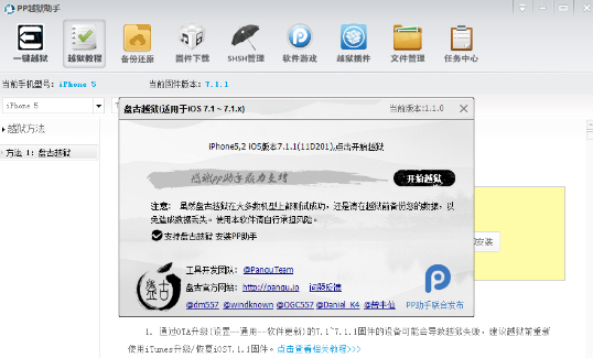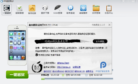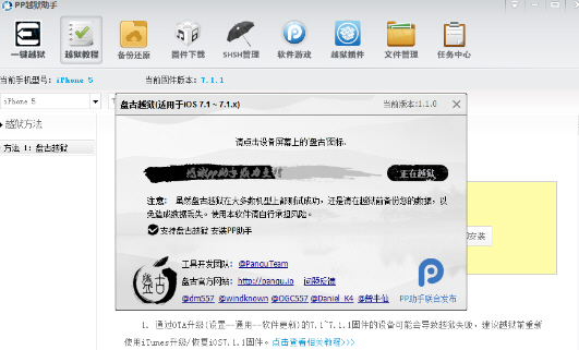 第三步:PP越狱助手自动识别iOS设备与固件版本自动弹出【盘古】越狱工具: