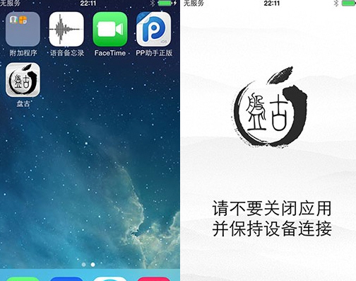 第六步:【盘古】越狱工具提示:请点击设备屏幕上的【盘古】图标,以继续越狱过程。