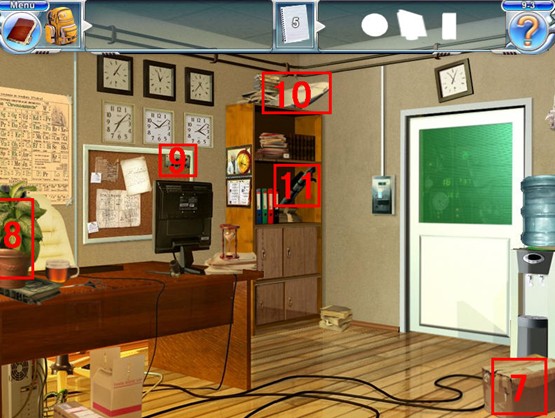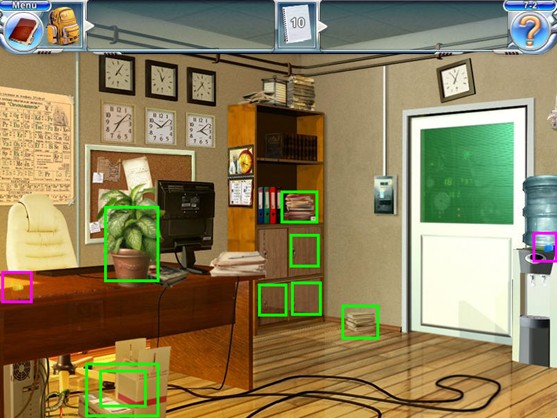 图二中也是10个,大部分都不在表面上,注意右边饮水机处有一个,书柜下面还是那三个老地方各一个,左下角箱子下面有两个。图二: