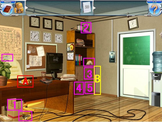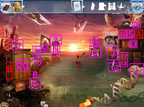 7-3、帮助教授在他的记忆里找到引起他恐惧症的原因。还是找物品啦,按顺序在图上标记出了,其中1处就是第一个物品那本书,图形不过是竖过来而已。4处是铁锚在螃蟹的下面,而物品8就是4处的那个水桶。9处是地球仪,10处海星在地球仪下面,。A处得到钥匙打开12处,得到大脑。17、18分别是铃铛和卷轴都在同一个柜子里,19是眼镜。得到前19个物品后,拿B处的撬棍打开20处的柜子,最后两个物品都在20处。图7.5