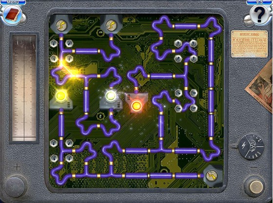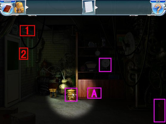 9-2、启动电力系统,先找到4个保险丝,图上用紫色框表示出来。在A处柜子里得到手套,手套后面有一个保险丝,其他的一个在钟表后面,一个在右下角灭火器下面,还有图上亮着的黄色罐子后面。找到保险丝和手套后,先把手套用在1处,然后放上保险丝,最后打开2处的开关。图9.2