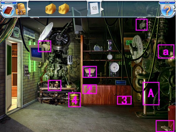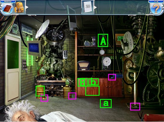 7-2、教授再次倒下…帮他找20个药片。在图一中找到10个,其中点A处的瓶子,瓶子后面有一个,落下摔碎在a处还有一个;打开B处柜子左上角铁罐里有两个;绿色框里都是在物品后面的,紫色框内是在表面上的,找齐10个后去图二。图一: