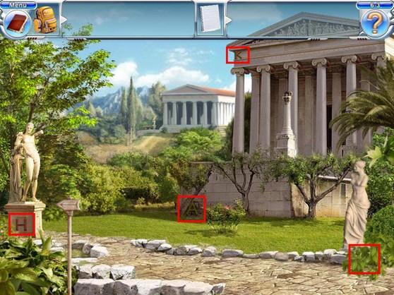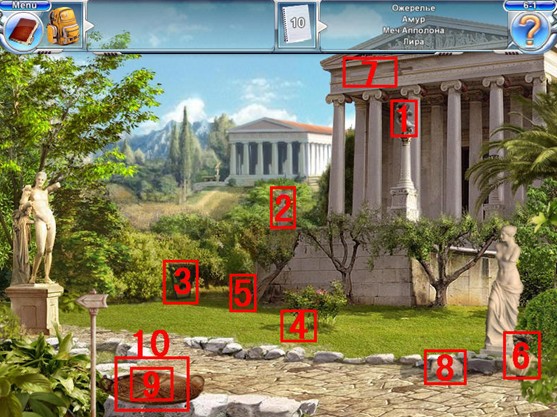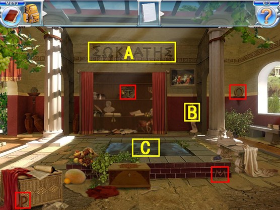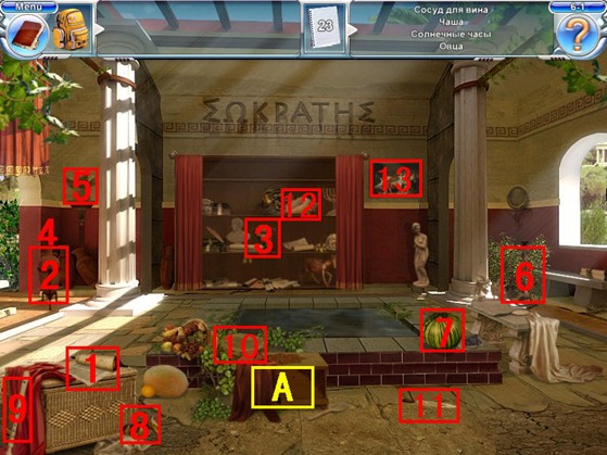 6-1、苏格拉底大叔没有穿衣服哦…嘿嘿,帮他找到衣服。因为这一关是根据单词找东西的,所以在图上我用数字表示出顺序。在图一中有13个物品,2处得到物品后,4处物品在2处后面。13处是幅画,打开后找到画最右下角的绵羊,绵羊在一开始就可以先得到。在这个图上找齐13个以后点最左边的门口去图二。图二中前9处得到物品后,才能看到第10个物品钥匙,拿钥匙回图一,打开A处箱子,得到衣服。图一: