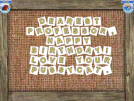 6-4、解码墙上那幅画背后的英文。字母只能每排或者每个单词互换,任意两行的字母不可以互换。正确的答案是:DEARESTPROFESSOR,HAPPYBIRTHDAY!LOVEYOURPUSSYCAT.如下图,最难猜的是最后的署名…图6.5