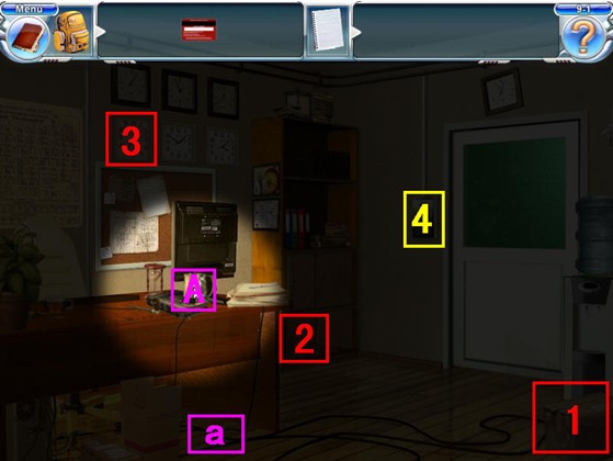 9-1、电力系统坏掉了,要找到三张卡片启动电源。1处箱子下面有一个,A处的杯子打翻在地上a处得到钥匙,开启2处的柜门得到第二张卡,第三张在3处的钟表后面。最后把三张卡按红、黄、绿的顺序在4处刷卡,就可以了。图9.1