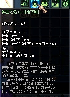 血之追忆,等级:8 (增加出血等级LV5命中0.9力量34还减少敌人出血抗性30,用屠戮太刀的应该都会满吧)