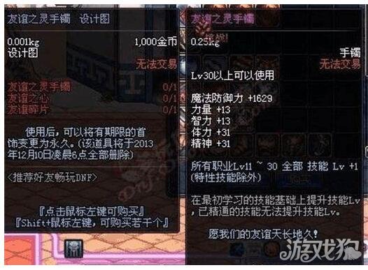 友谊之灵手镯:所有职业11到30级技能+1,不知道的人可能看到这个属性并没有太大的感觉,但是小伙伴们要知道这是唯一一件加技能等级的,对于输出职业可能只是锦上添花的作用,但是对于奶爸和奶妈可能就不一样了,唯一的缺点就是不能强化与增幅,对于任何一个职业加一级BUFF也是不错的