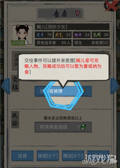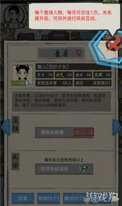 每个登场人物,每月可交往1次。关系提升后,可进行风俗互动。