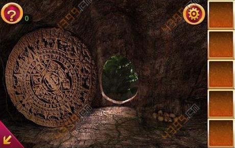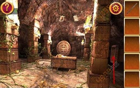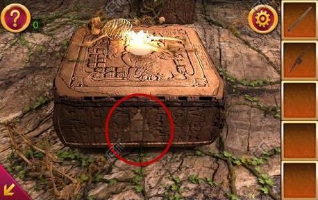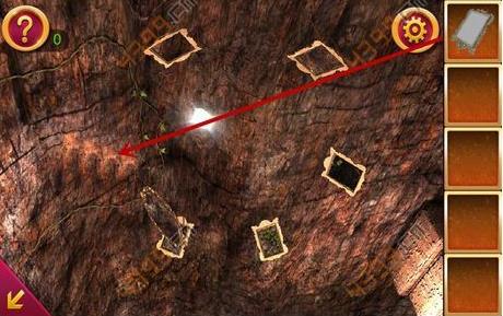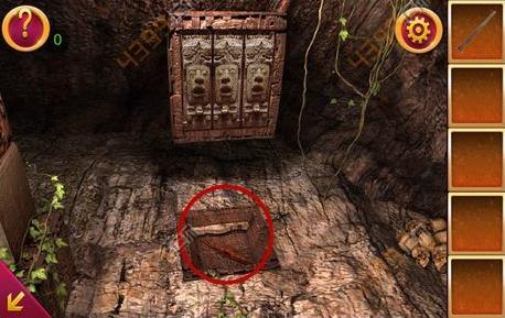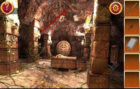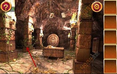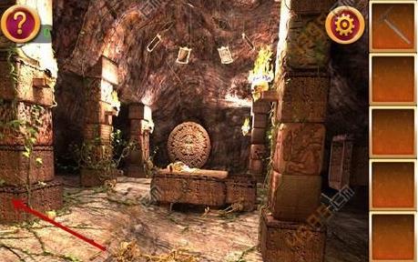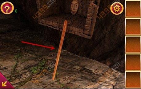 2、得到木棍后,点击图中箭头所指位置,可以看到三个人面石像,点击顺序为左右中,这时得到铁锹的头。