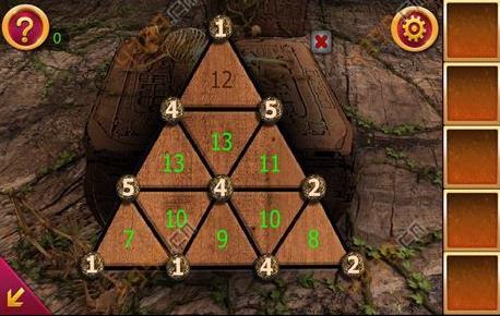 3、点击图中箭头所指位置,看到石板上有三角形区域,点击它发现是一密码器,旁边三个圈中的数字加起来的和要等于中间三角形内的数字,小甲已经把下面的都弄好了,最上面那个用户自己填哈,打开石板后,得到镜子。