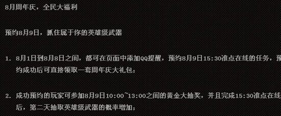 预约8月9日15:30准点在线任务,成功后可以直接领取一套周年庆大礼包,此外还可以参与黄金大抽奖。