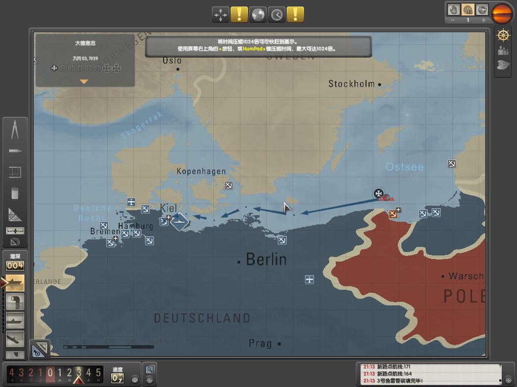 最后返回海军基地,基尔港。 按M键或者右上角的海图或者指挥舱桌面上的海图。 同样连接处航行路线,可以多次点击路线,避开陆地海道。 滚轮可以放大和缩小海图。 右上角有时间压缩倍于。可以压缩时间速度。最后到了港口后在右上角有港口的图标,点击选第二项就能结束巡航