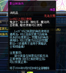职业转换书,Lv15-85可以使用,看上面的描述,女鬼剑士没有包含在里面~