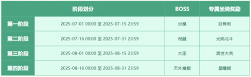 每阶段时间划分情况,及BOSS携带宝物等坐骑奖励如下: