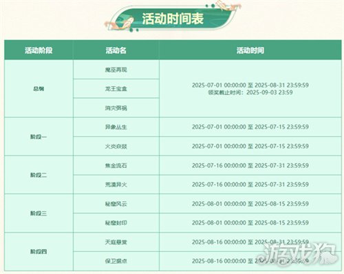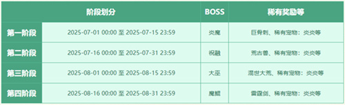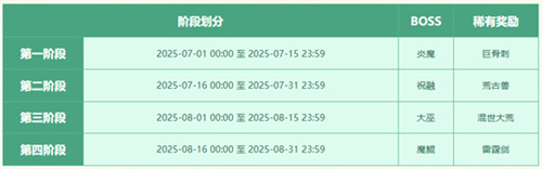 各阶段时间划分,及BOSS携带稀有奖励(达到一定战力的玩家可获得稀有奖励)如下: