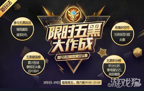 万众期待的新玩法-五黑大作战模式,将在3月1日版本更新后与大家见面!3月1日-3月29日每周五、六晚限时开启,参与新玩法可赢取5款五黑限定头像、剑圣Q版限定头像、海量芯片碎片、钻石等稀有奖励!